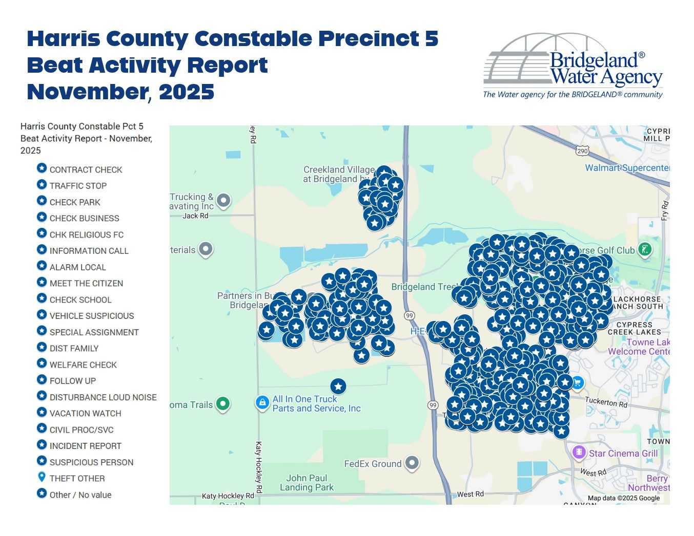 BWA contracts with Harris County Constable Precinct 5 to provide consistent, visible patrols and rapid response throughout the area. These officers are dedicated to serving the BWA community and work to deter crime, respond to calls, and build relationships with residents.
