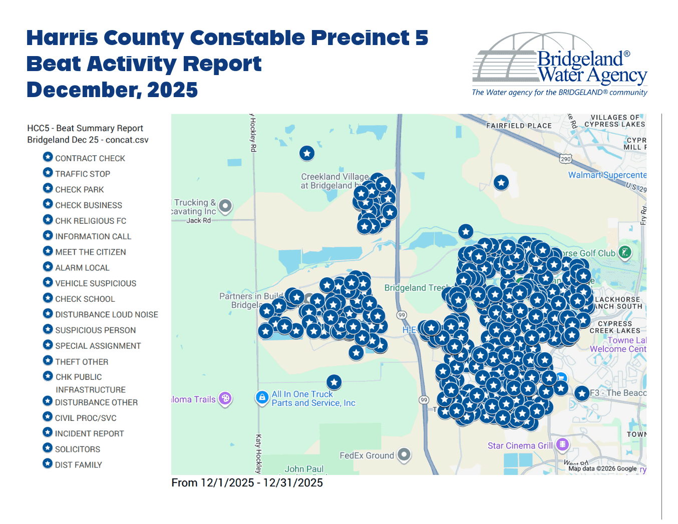 Local patrols, like the deputies assigned to Bridgeland through our contract with the Constable's Office, focus specifically on our neighborhoods. They provide faster response times, consistent visibility, and community-focused policing tailored to the needs of BWA residents.