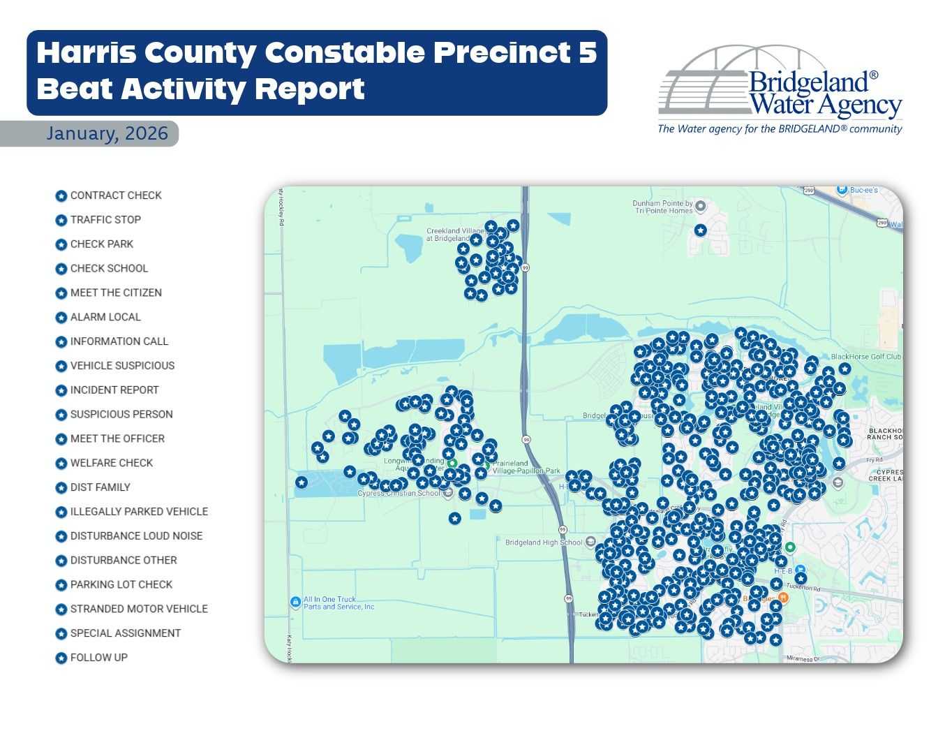 BWA contracts with Harris County Constable Precinct 5 to provide consistent, visible patrols and rapid response throughout the area. These officers are dedicated to serving the BWA community and work to deter crime, respond to calls, and build relationships with residents.